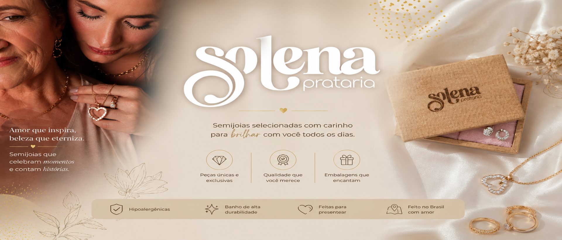 Cada peça da Solena Prataria nasce de um cuidado artesanal, pensado para atravessar gerações. Materiais nobres, design atemporal e a delicadeza de quem entende que joia é memória.